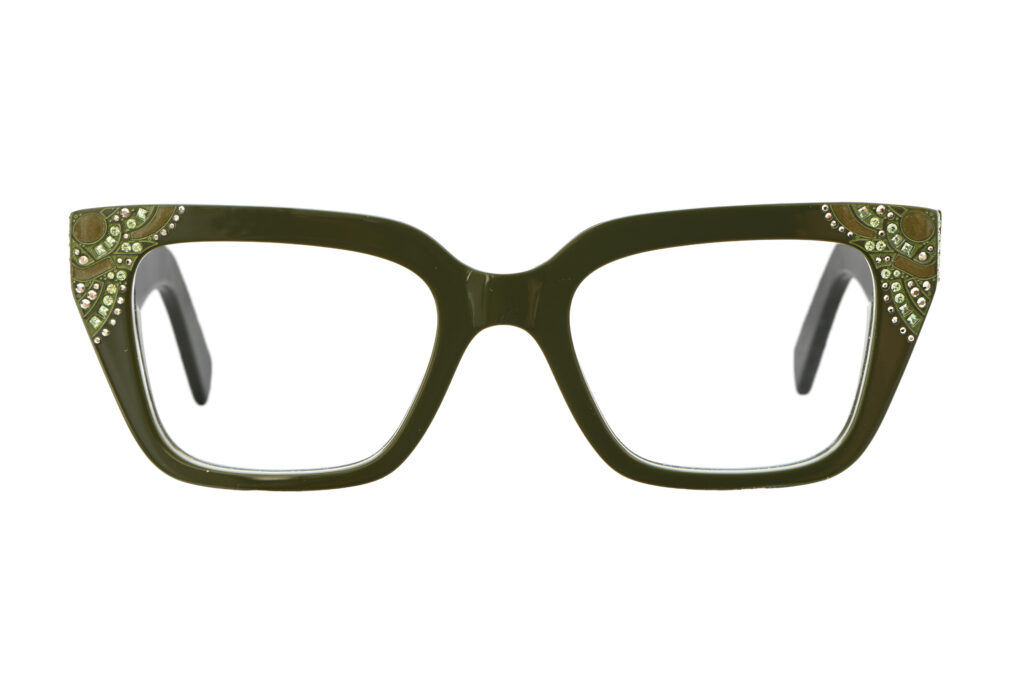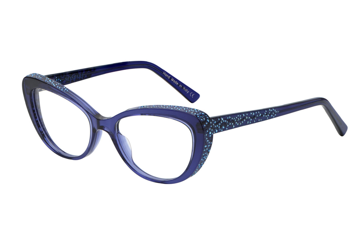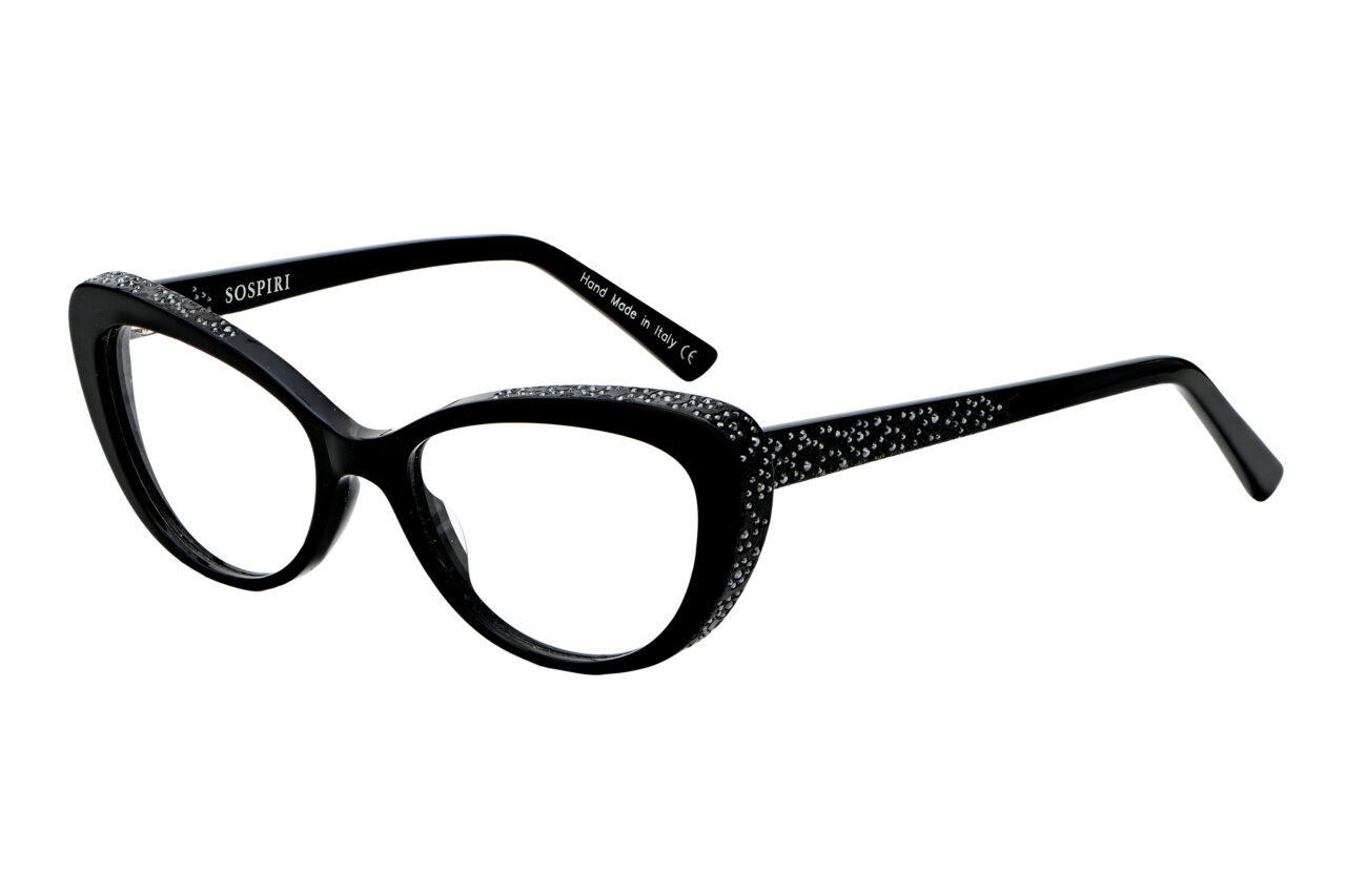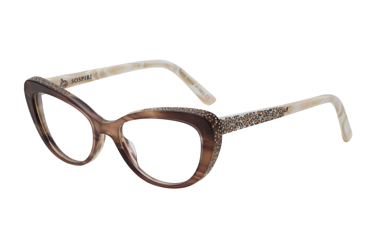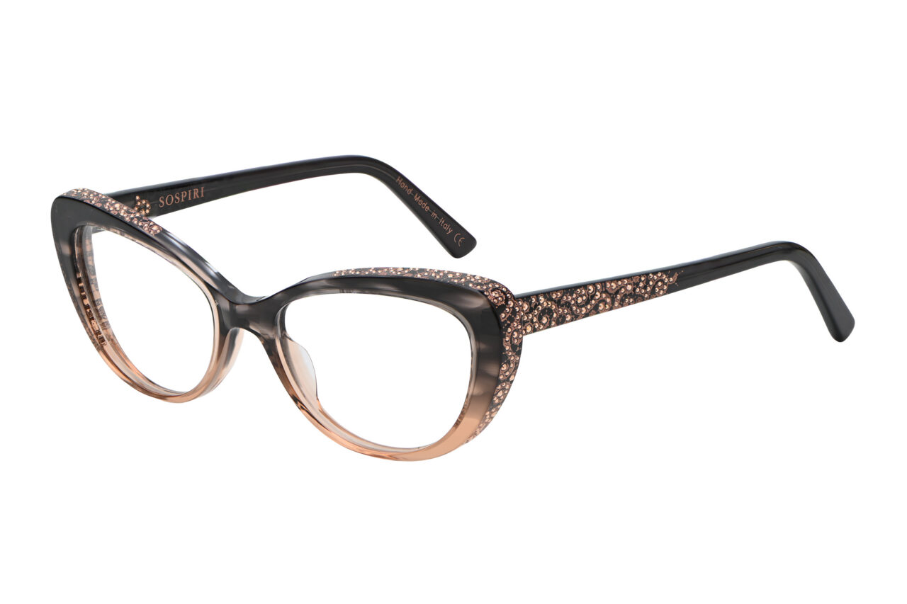 A clean cat-eye front defines FRANCESCA with a crisp, confident outline. Baroque laser work and concentrated crystal detailing animate the temples, creating a striking interplay between restraint at the front and ornament along the sides.