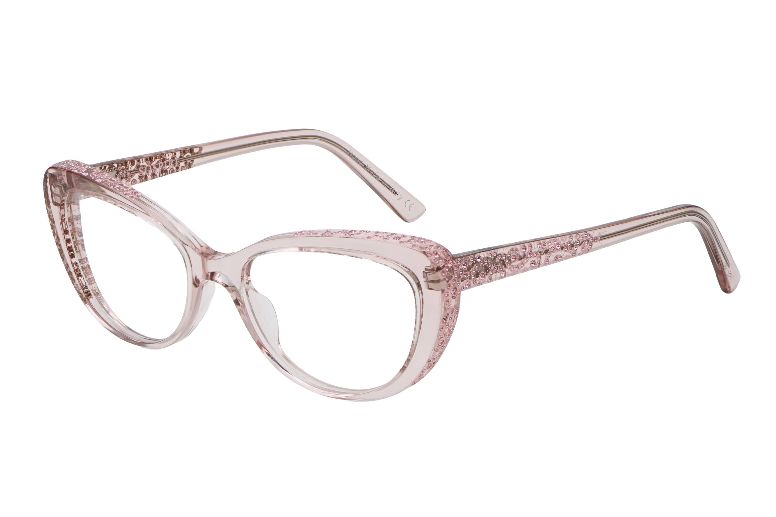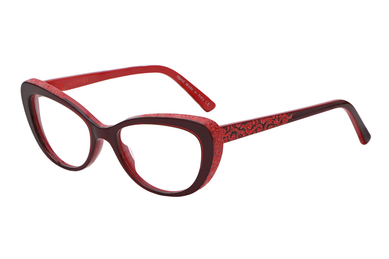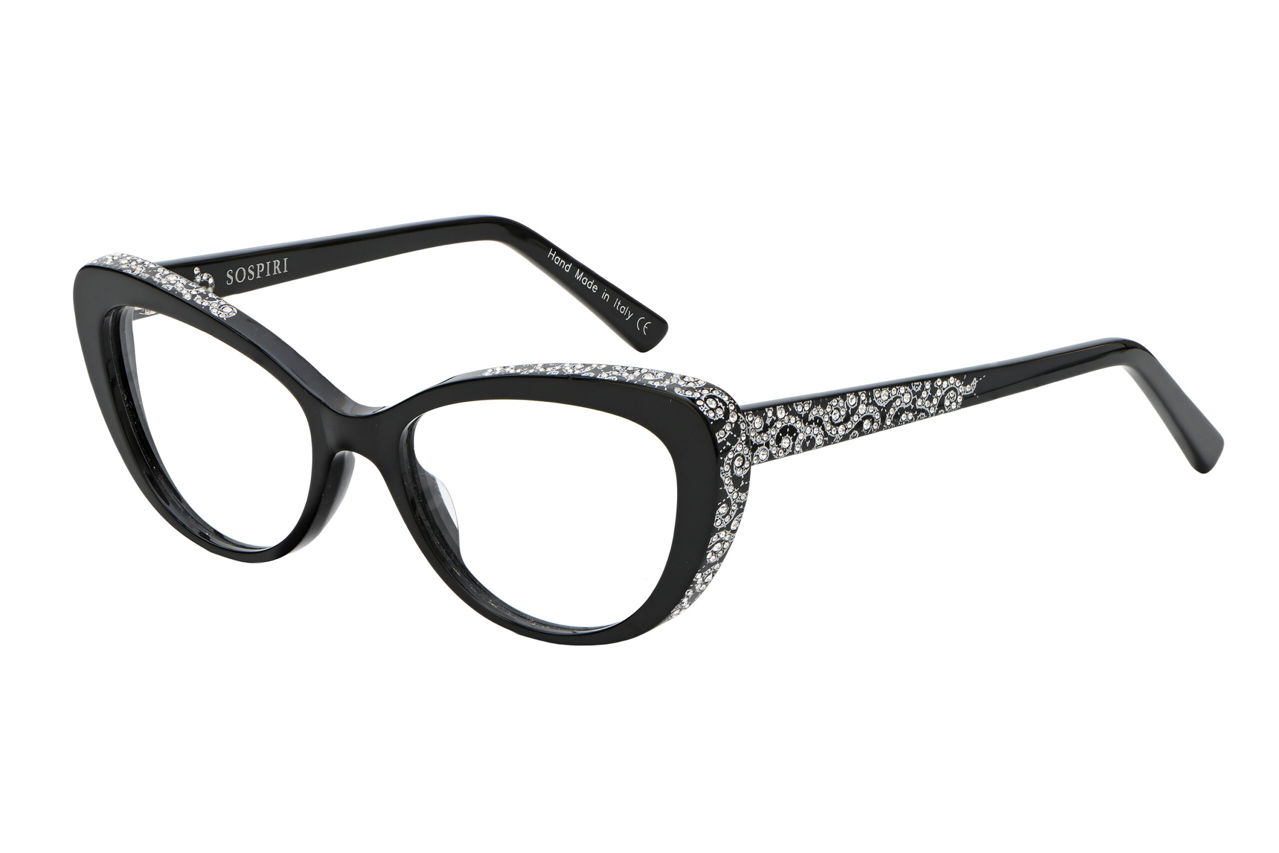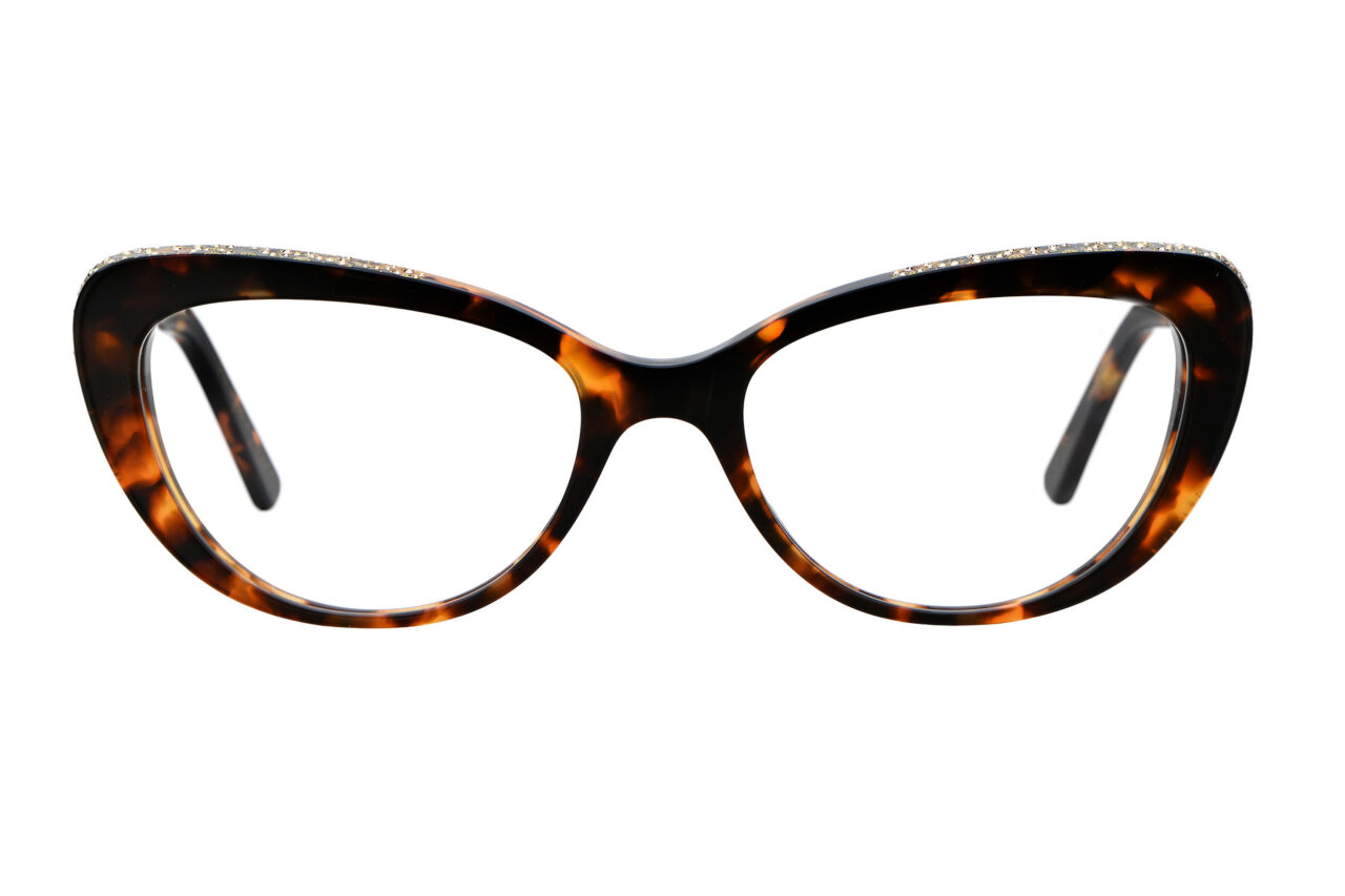 A clean cat-eye front defines FRANCESCA with a crisp, confident outline. Baroque laser work and concentrated crystal detailing animate the temples, creating a striking interplay between restraint at the front and ornament along the sides.