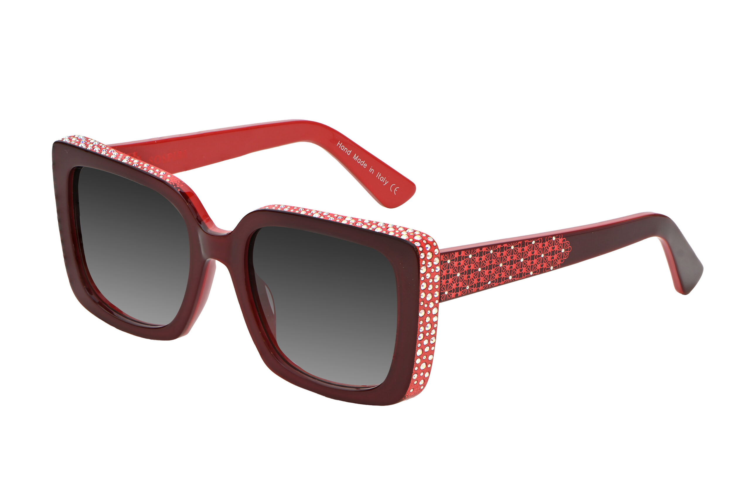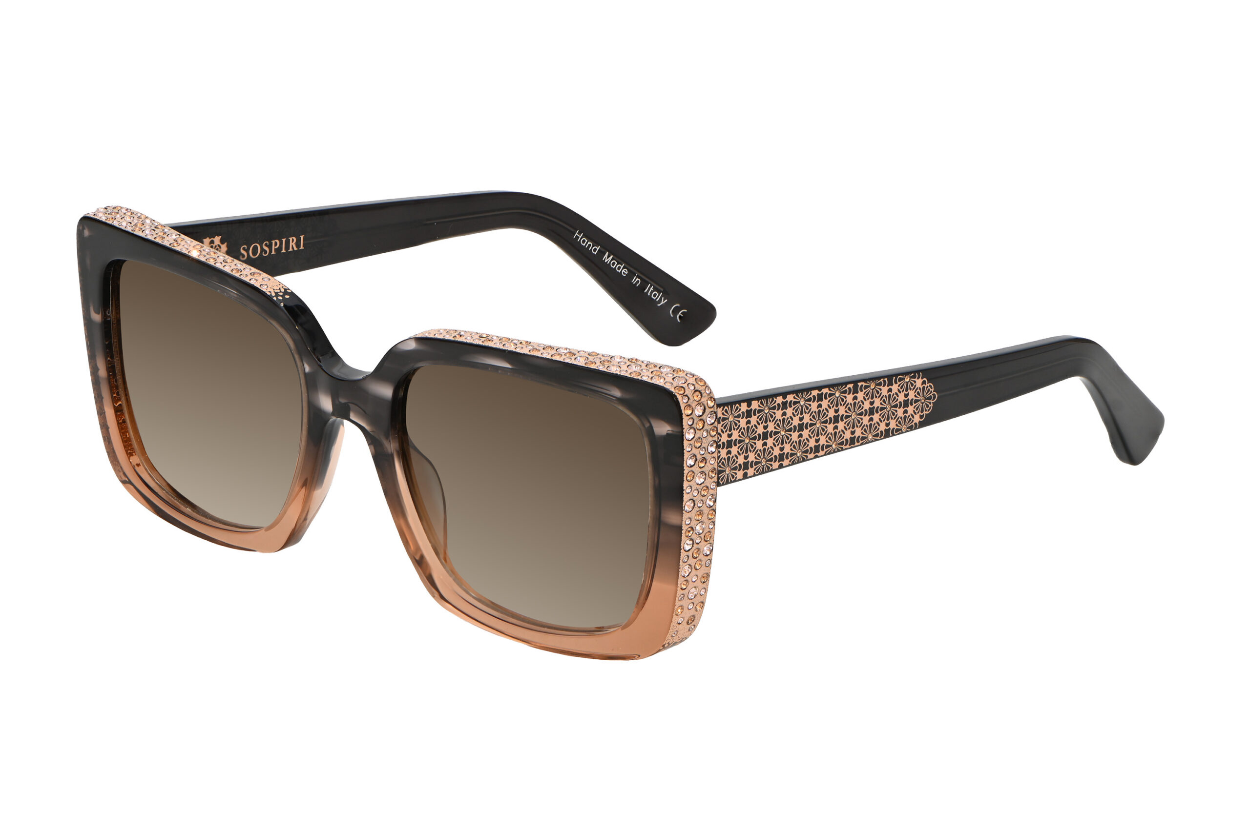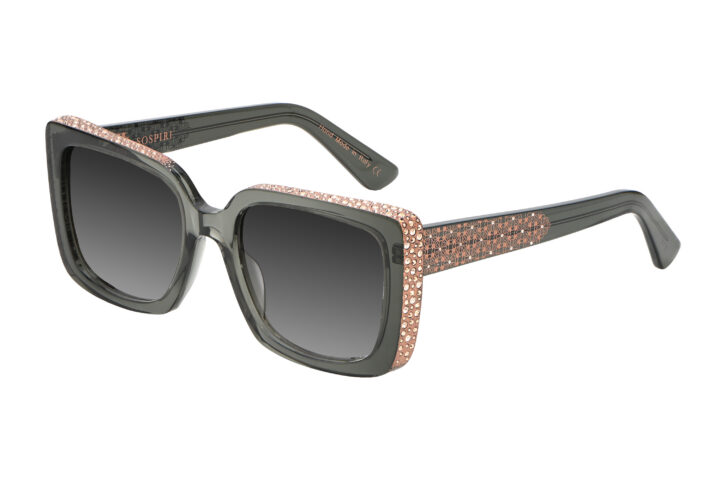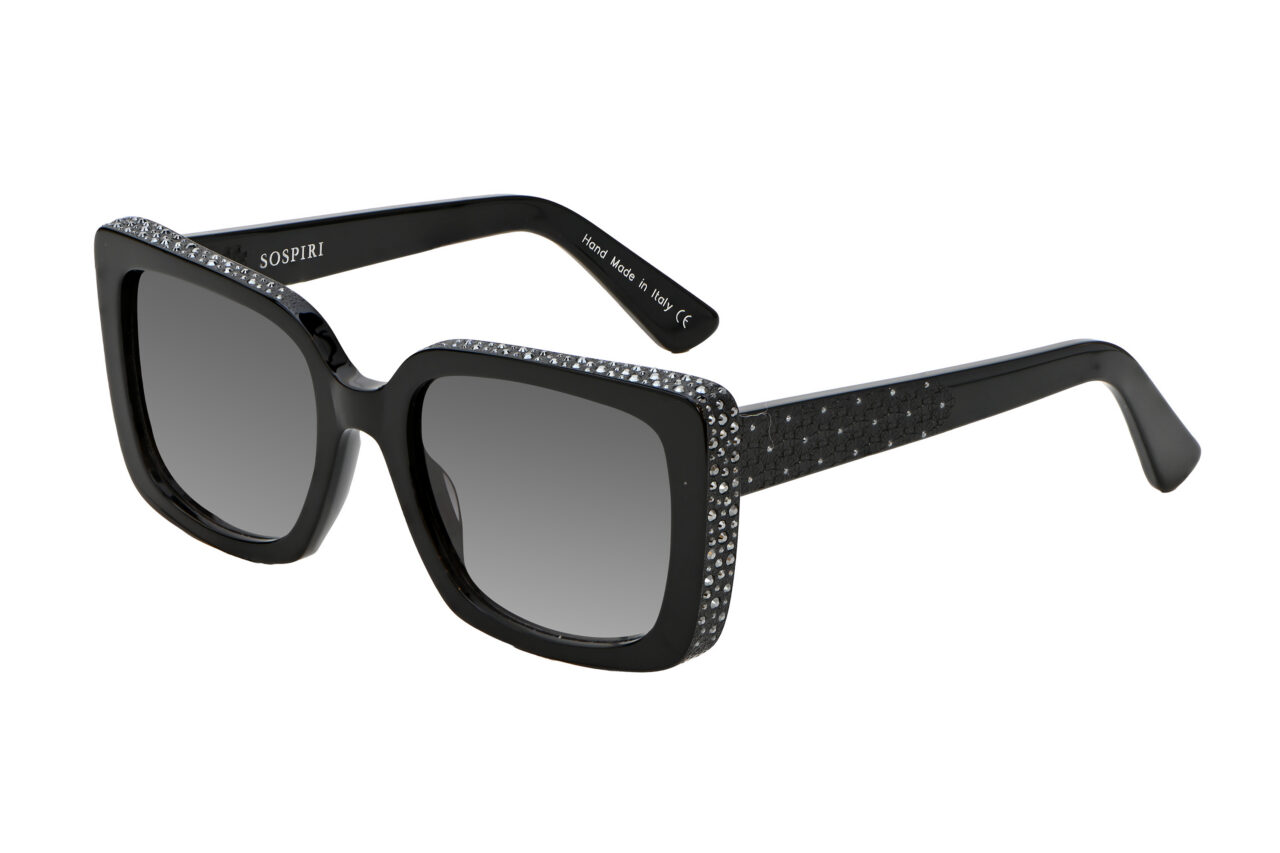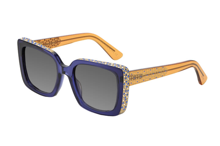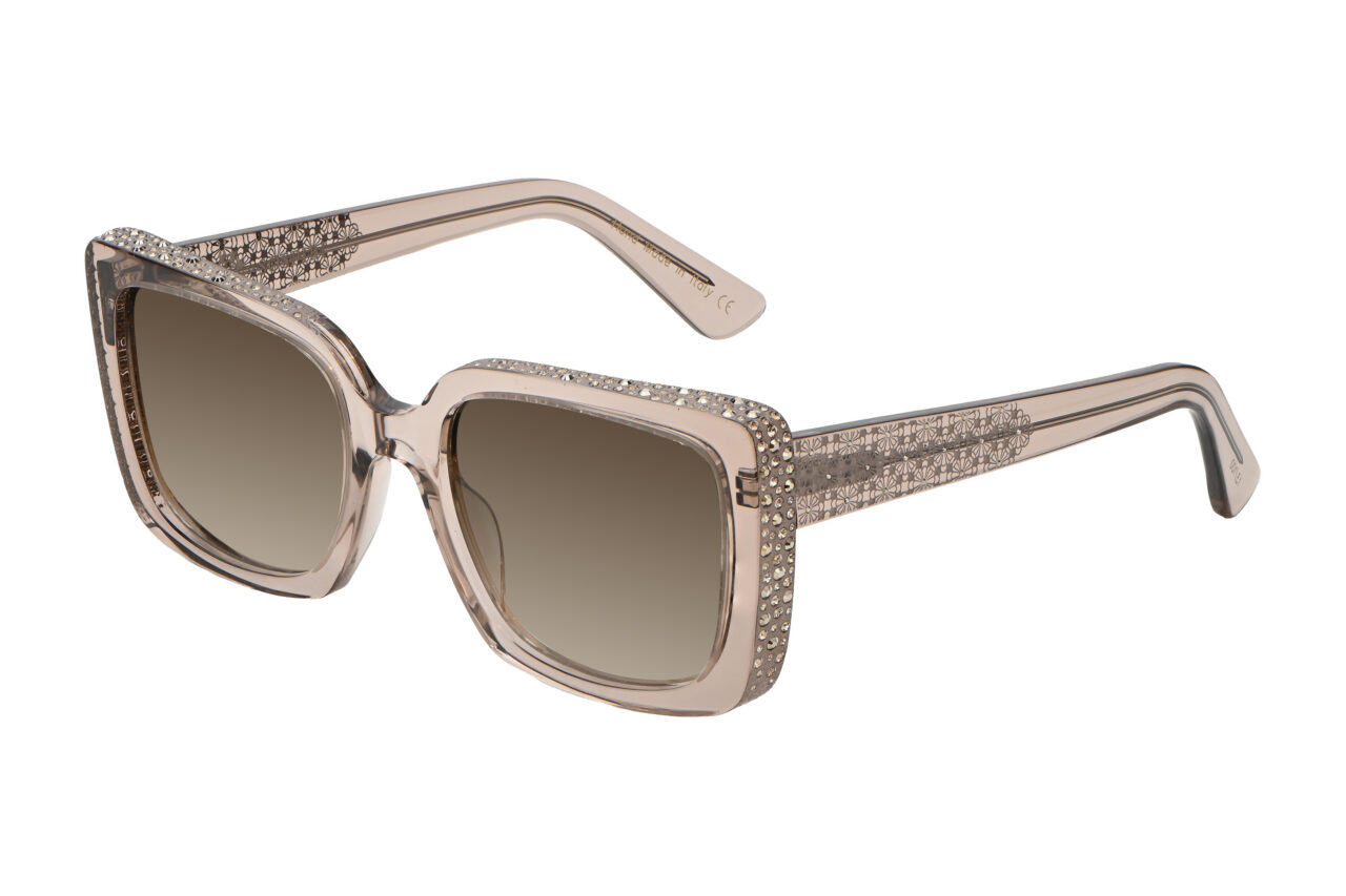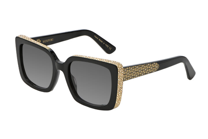 SOFIA features a clean, oversized front that highlights its strong geometric outline. A precise line of crystals traces the outer edges, adding dimension without overwhelming the design. Along the temples, floral laser work recalls the carved detailing inside Venetian palazzi, bringing intricate character to the model’s structured form.