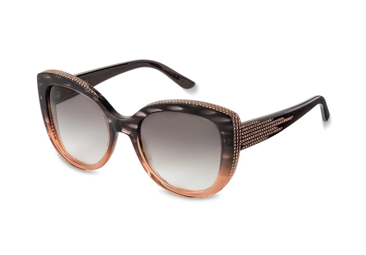 Plum cherry fade with amethyst and orange-pink crystals and gold laser work